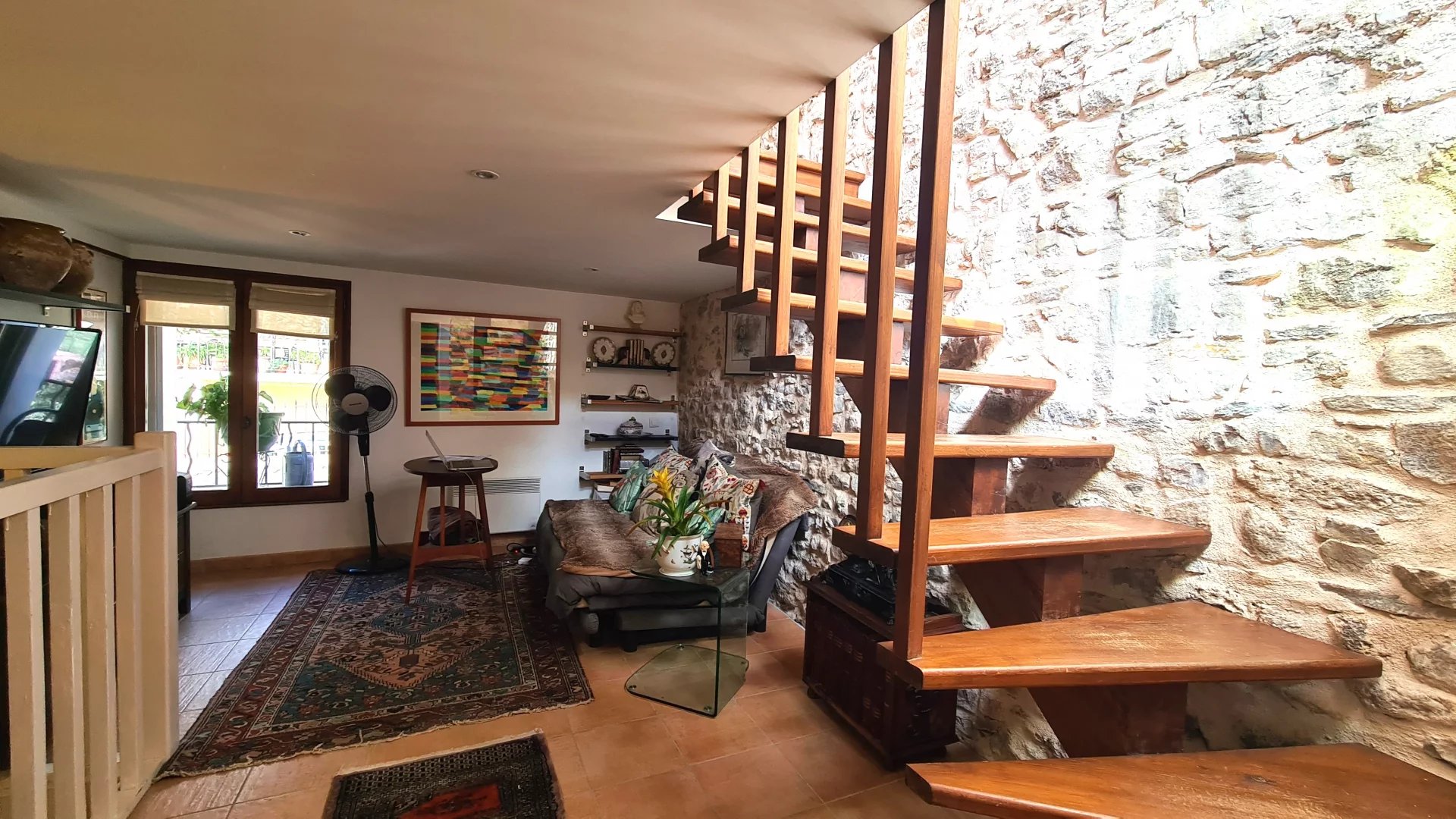 The top floor is a true delight: a summer kitchen opens onto a private terrace framed by beautiful exposed stone walls and offering sweeping views over the rooftops to the countryside beyond – ideal for long summer evenings.